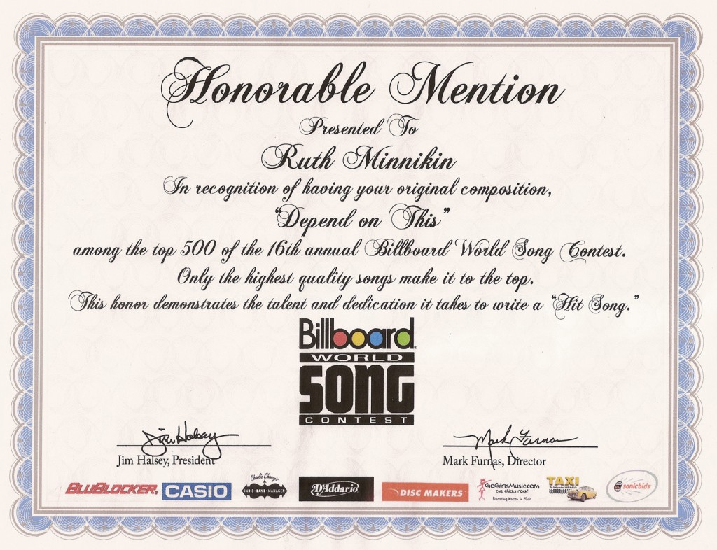 Ruth’s song ‘Depend on This’, received honorable mention in Billboard’s World Song Contest!!